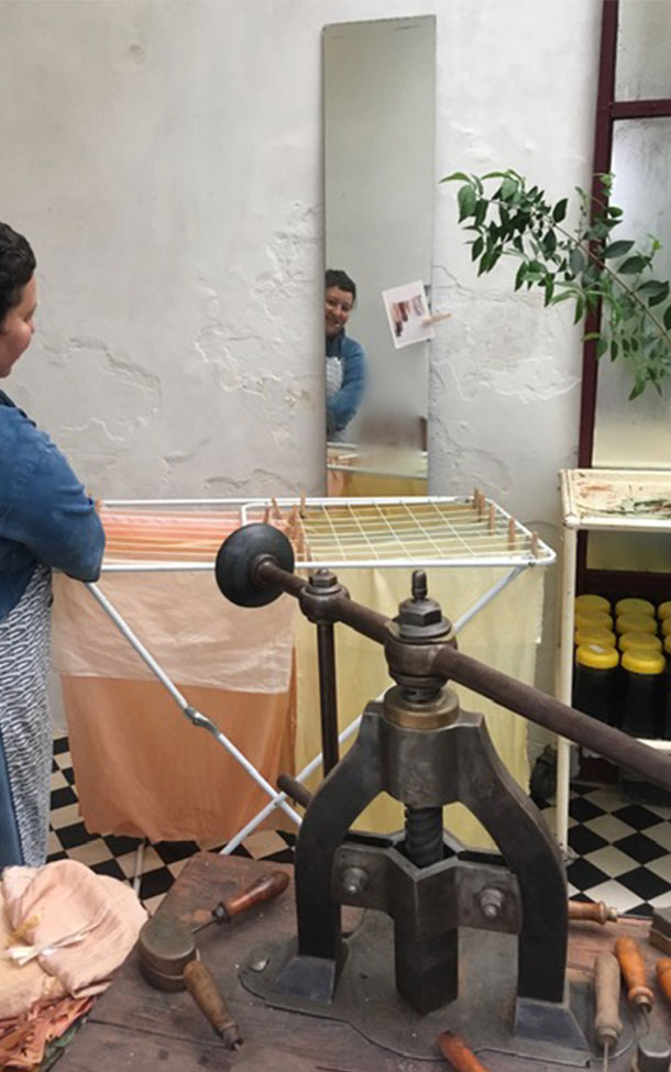 Ma complice teinturière c’est Carmel Peritore que j’ai rencontrée à l’Opéra de la Monnaie en travaillant sur les costumes d’une production. On a toutes deux suivi avec enthousiasme plusieurs formations professionnelles spécialisées en teintures naturelles, avec des maîtres passionnés de référence: Betty de Paris, Michel Garcia, Sandrine Rozier, et David Santandreu.