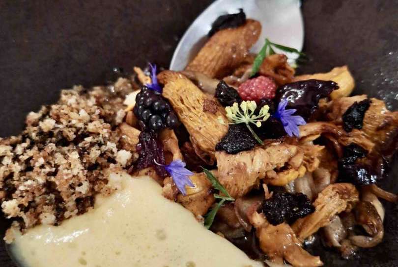 Pas de plats à la carte, juste deux menus en 4 ou 5 escales, qui changent chaque mois. Les mises en bouche sont à tomber : sushi de maquereau, lait ribot, fenouil bronze, galette de sarrasin et croquette de joue de boeuf sur une confiture d’algues et raifort. Rien à redire, si ce n’est que c’est fameux et que ça monte en puissance. Première entrée : pickles de chanterelles maison, shiitakés, fruits de saison, crème de pain brûlé et, pour parfaire le tableau, jus de champi servi dans un mug en grès — shot forestier garanti. Deuxième entrée : truite saumonée, aubergine japonaise à la texture parfaite, dashi. C’est ultra fin et gourmand à la fois. Un vrai pas de deux entre la générosité méditerranéenne et la discipline nippone.