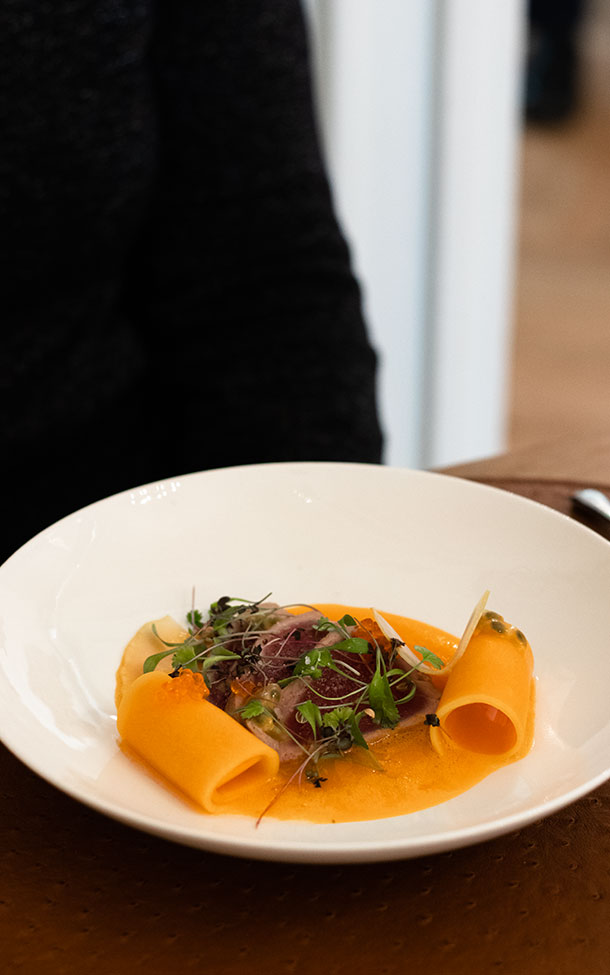 Le lunch 3 services (39€) est équilibré et séduisant. On débute avec l’œuf parfait, plat emblématique redéfinit chaque quinzaine pour ne pas s’essouffler. Pour nous, il est accompagné d’une crème de lentilles corail, d’un jus de carottes épicé, de lard fumé, de cresson et de choux de Bruxelles : une recette inspirée du dhal, un plat végétarien réconfortant. On teste également le mi-cuit de thon, butternut, fruit de la passion et cédrat (un agrume proche du citron) : légèrement surette, la sauce s’accorde parfaitement à la douceur du poisson.