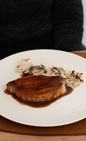 Pour poursuivre, un filet de bar en croûte d’herbes, crème de pommes de terre et palourdes, salicornes et poireaux. Tout aussi gourmand, le carré de porc Brasvar, jus truffé, purée de panais et gorgonzola et chou pointu rôti.