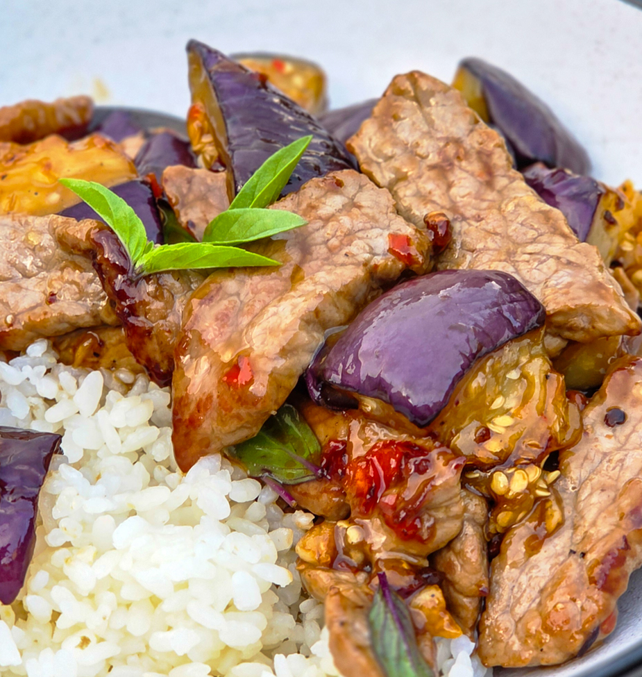 Improvisation autour du célèbre pad kra prao Thaïlandais, ce bœuf sauté aux aubergines et piment est une petite bombe de saveurs, au piquant modulable en variant la quantité et le type de piment!