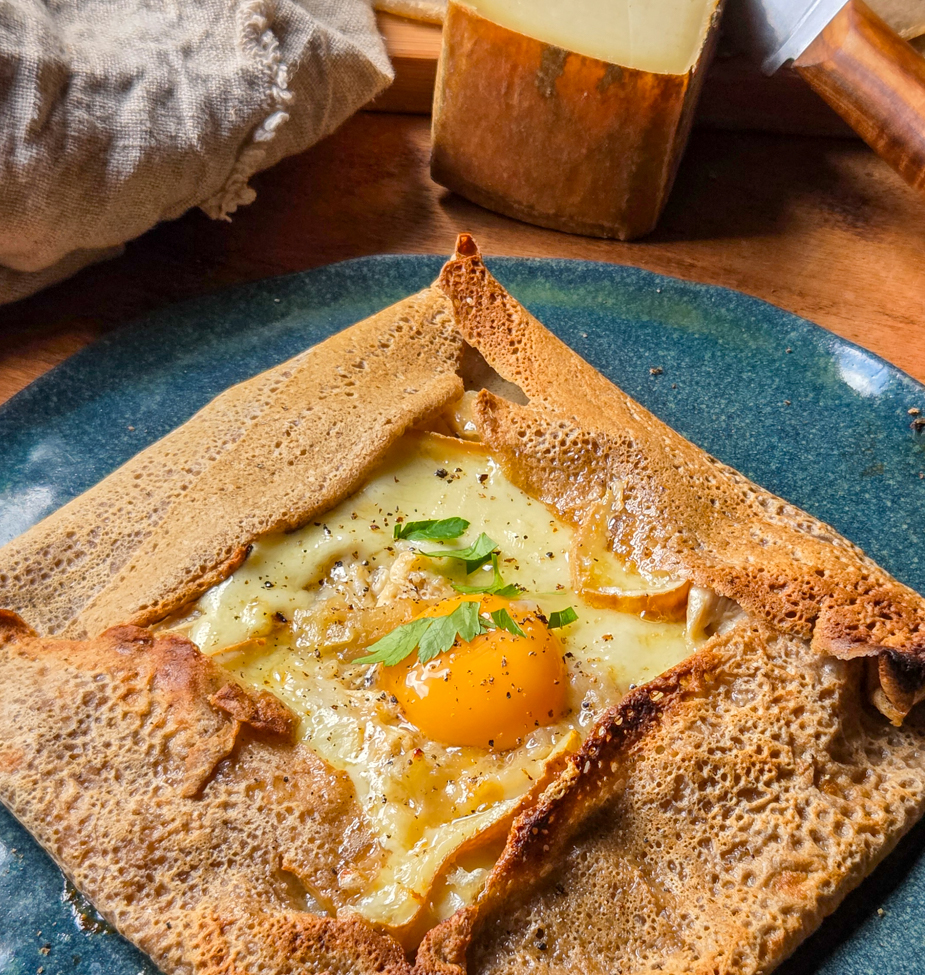 C’est la saison des crêpes, et je rentre d’un beau voyage à Verbier en Val de Bagnes avec un beau morceau de fromage à raclette (Bagnes 1 pour les connaisseurs) artisanal, de la Laiterie de Verbier, sous le bras…. L’occasion rêvée de marier la puissance d’une galette de sarrasin aux saveurs onctueuses et gratinées du fromage, le tout lié par une fondue d’oignons et un jaune d’œuf juste chauffé sur la crêpe…. Une dinguerie!