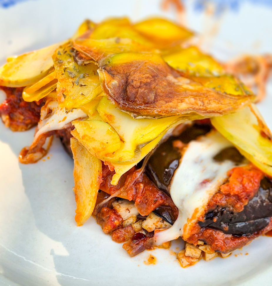Improvisation très très gourmande sur une envie d’aubergines rôties, pour ce gratin d’inspiration moussaka végé et parmigiana… Assemblage de très bons ingrédients, pour un plat d’été ultra réconfortant!