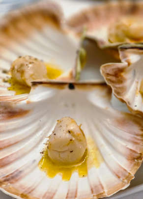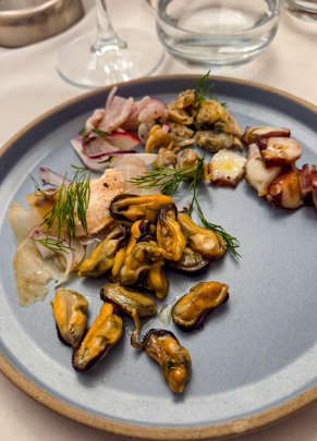 Coquille Saint-Jacques au beurre noisette, ceviche de bar tout en fraîcheur, un autre garni de tarama puissante, tentacules fondantes à l’huile, moules dans leur plus simple appareil , gambas grillées très gourmandes, et cet incroyable sushi de crevette crue, laqué de sauce soja et une pointe de wasabi, un bonbon fondant…