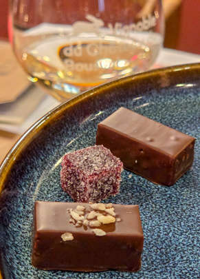 Le Pinot noir exprime pleinement ses arômes de fruits, croqué avec un chocolat noir et doux aux fruits rouges, tandis que les matières issues de la vinification sont distillés en Marc de Bousval proposés en dégustation gourmande avec un praliné noisettes…