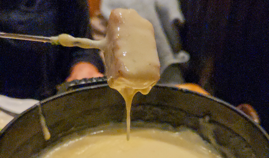 Servie en caquelon de fonte fumant, le mélange de Comté, Gruyère, Emmenthal et Beaufort fondus, additionnés de vin blanc sec Suisse et d’une touche de Vermout, est vraiment très très savoureux!
