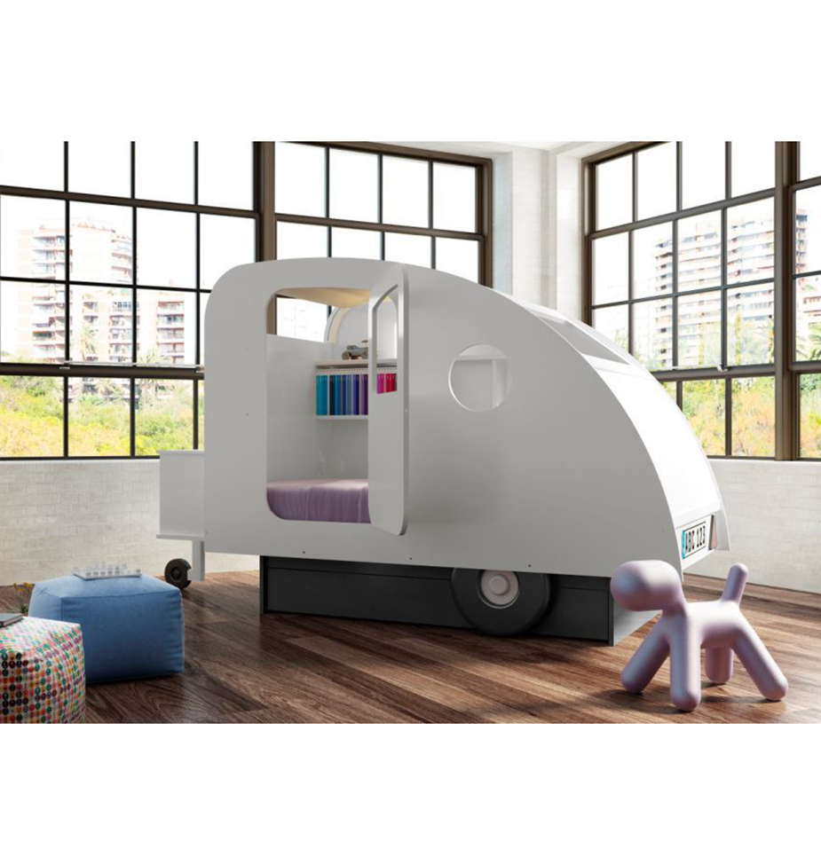 Ce meuble bien pensé existe en bois brut naturel ou en de nombreux coloris au choix, sa peinture est écologique, aux normes non toxique, il est laqué à l’eau. Le lit est pourvu d’un socle, une porte avec ouverture à droite ou gauche. A l’intérieur de la caravane, un rangement le long du matelas, deux tablettes et deux porte-manteaux. Telle une vraie, cette caravane dispose à l’arrière d’une plaque d’immatriculation et de 2 feux catadioptres. Le lit est fabriqué artisanalement en Belgique. Livré en kit, facile à monter. Il convient aux enfant à partir de 3 ans.