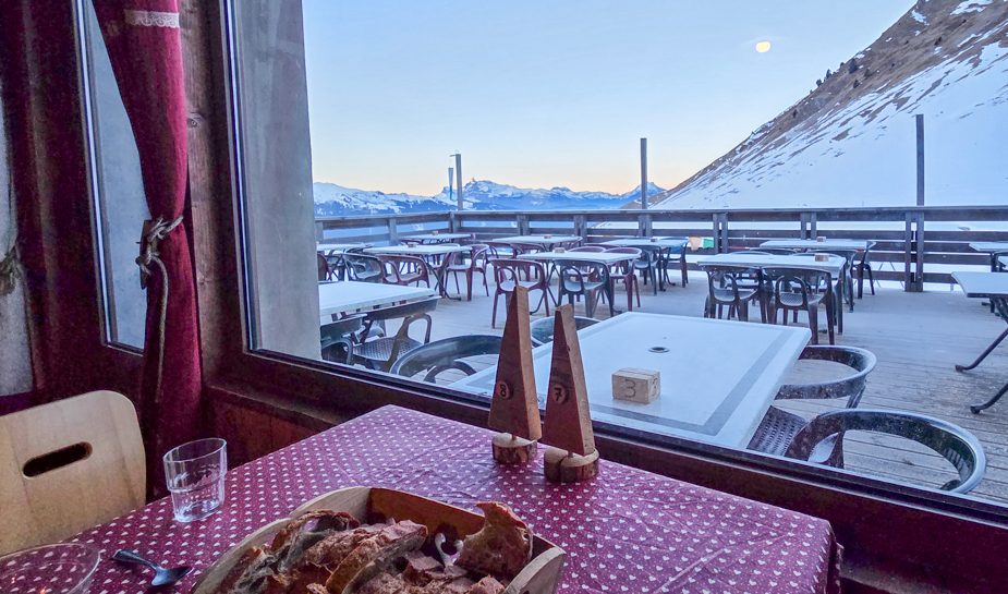 Le réconfort ultime vient de la cuisine ou Jérôme et son équipe nous ont préparé un repas bien chaud et nourrissant! Soupe de légume bien épaisse et réconfortante, tartiflette au reblochon, et parce qu’on a peur de rien après notre ascension: une petite fondue! Tarte aux myrtilles et génépi , partagés en grande tablée de randonneurs.
